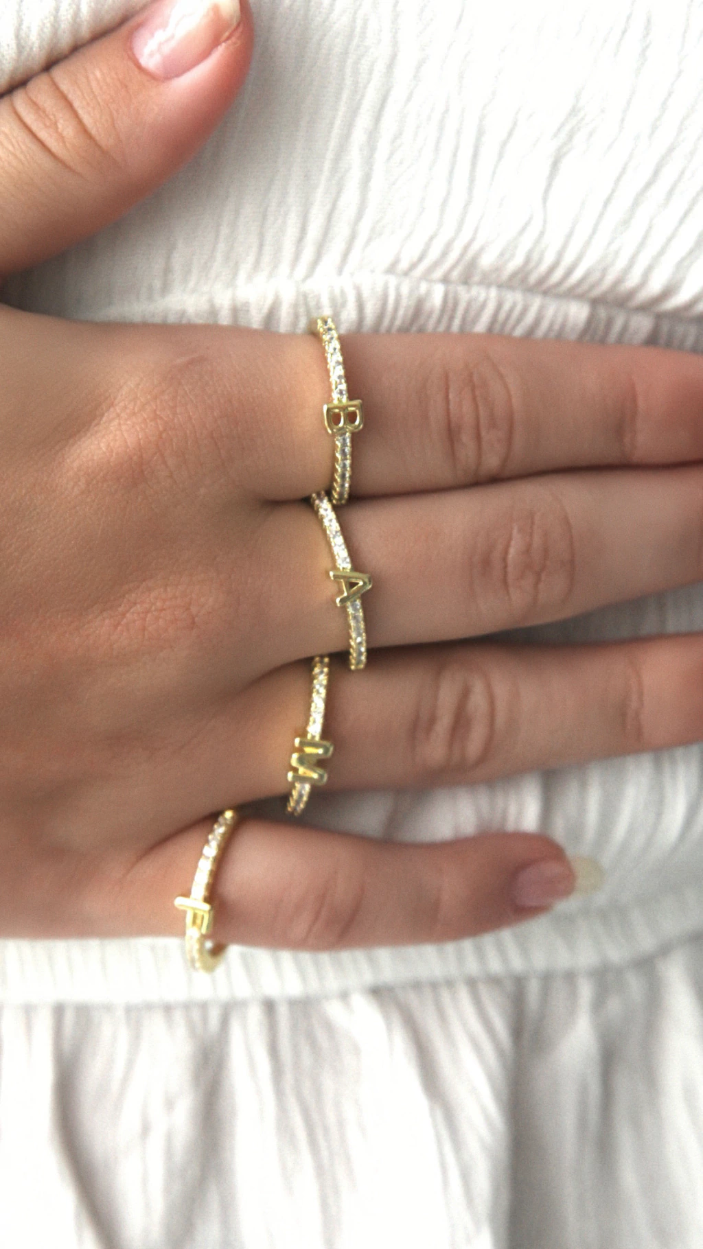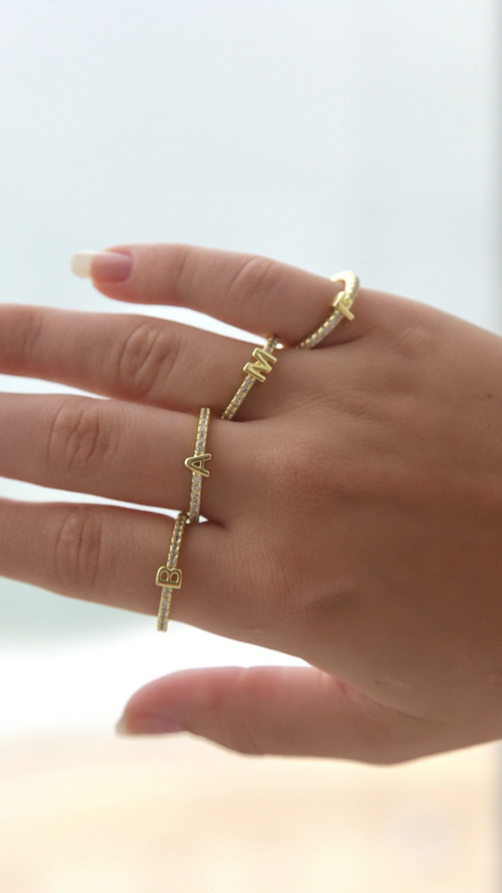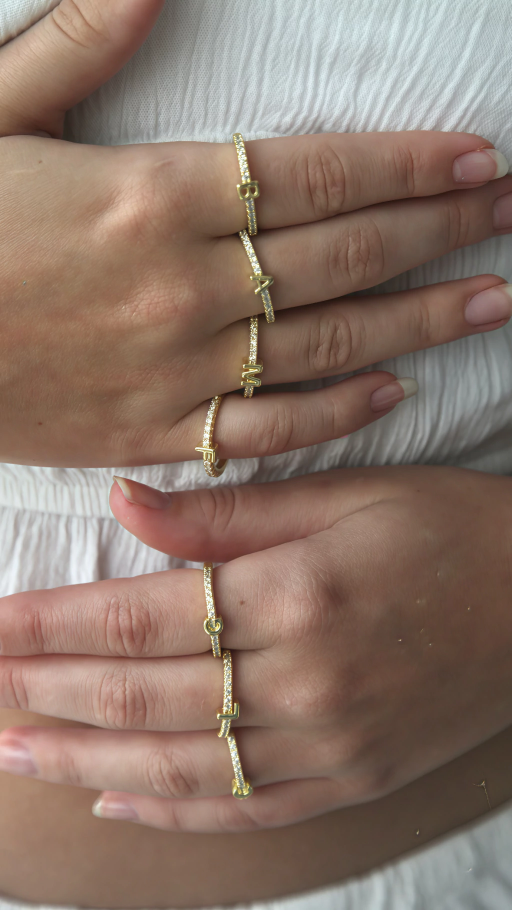 O Anel Inicial Ajustável é delicado, cravejado com zircônias em seu aro e traz o toque único da sua inicial.