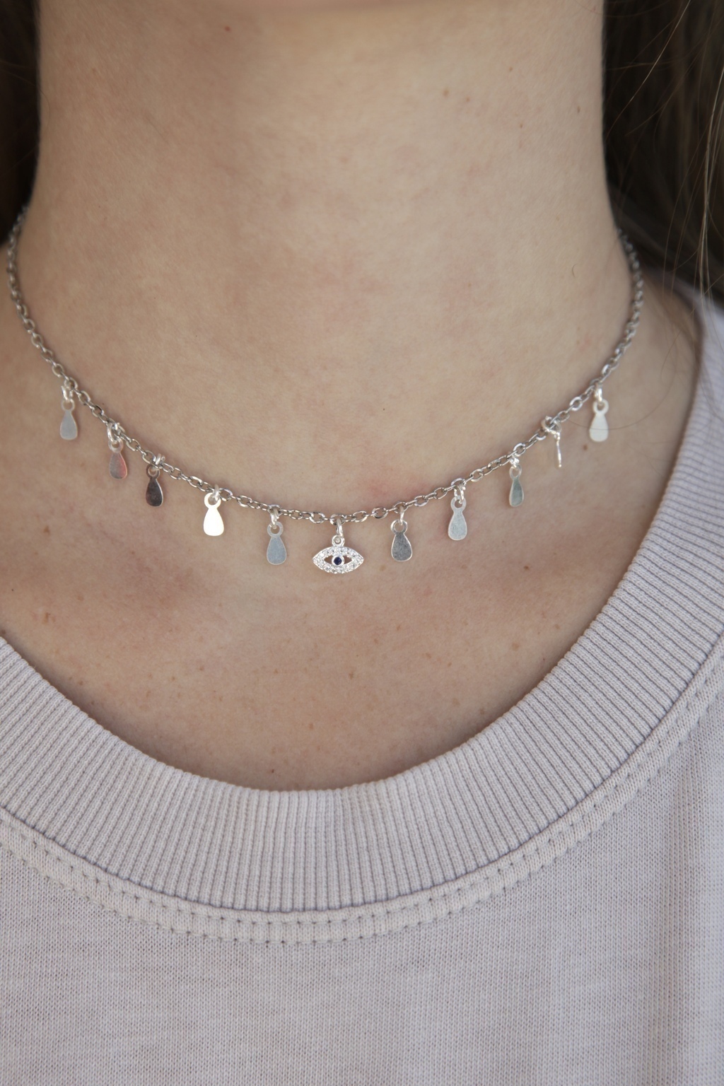 Uma choker minimalista e chic, produzida de forma manual pela nossa equipe de artesãos, uma semijoia autoral e muito delicada! Cada detalhe dela impressiona, o conjunto do pingente de olho grego com pontos de zircônia mais as gotinhas é encantador! Um acessório único e feito para te proteger!