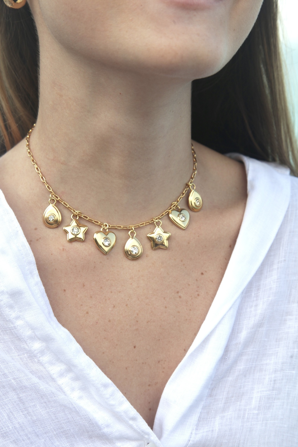Choker correntinha com pingentes de estrela, gota e coração, todos com um ponto de strass.