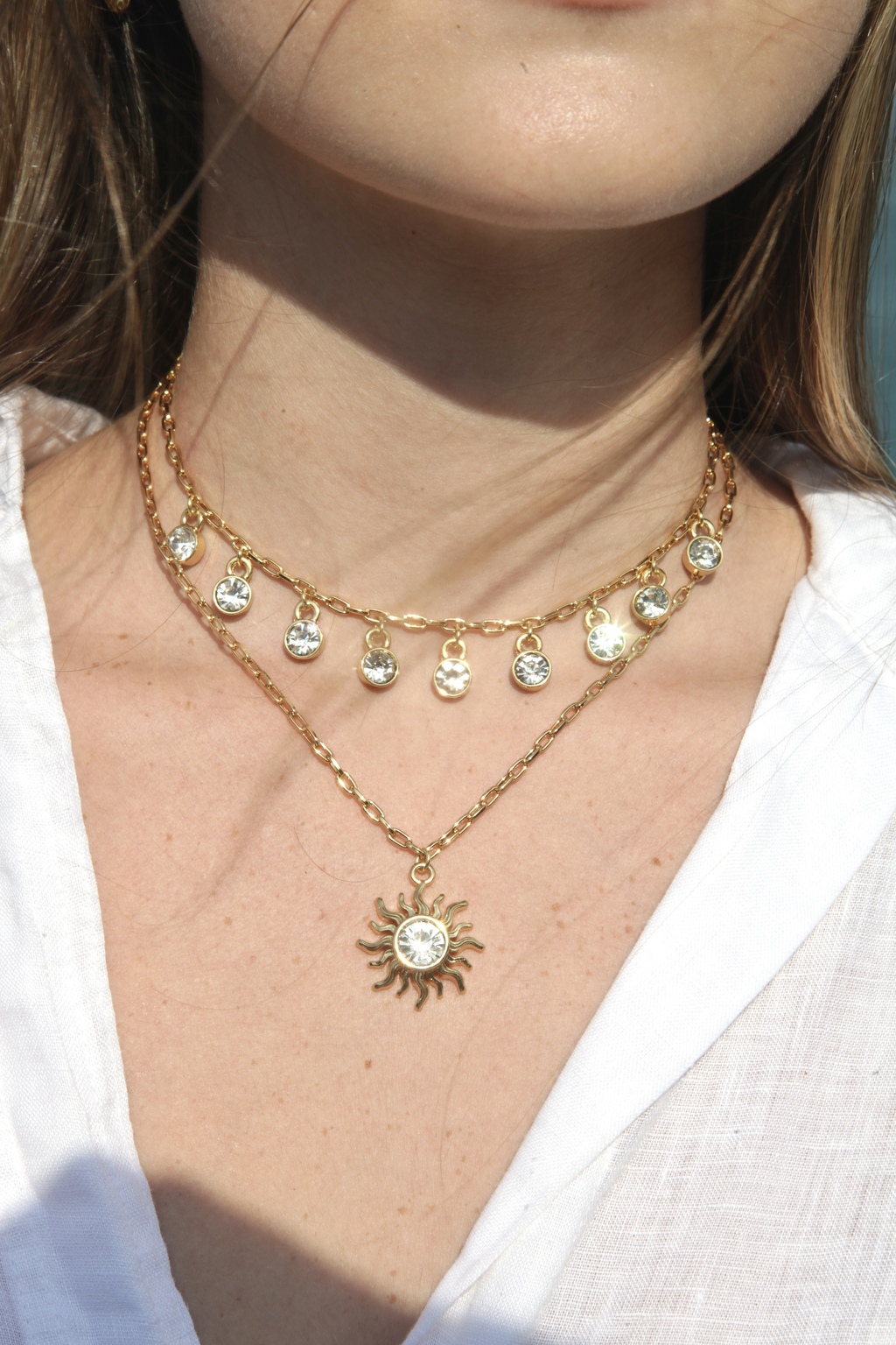 Choker correntinha com pingente de sol e ponto de luz em strass.