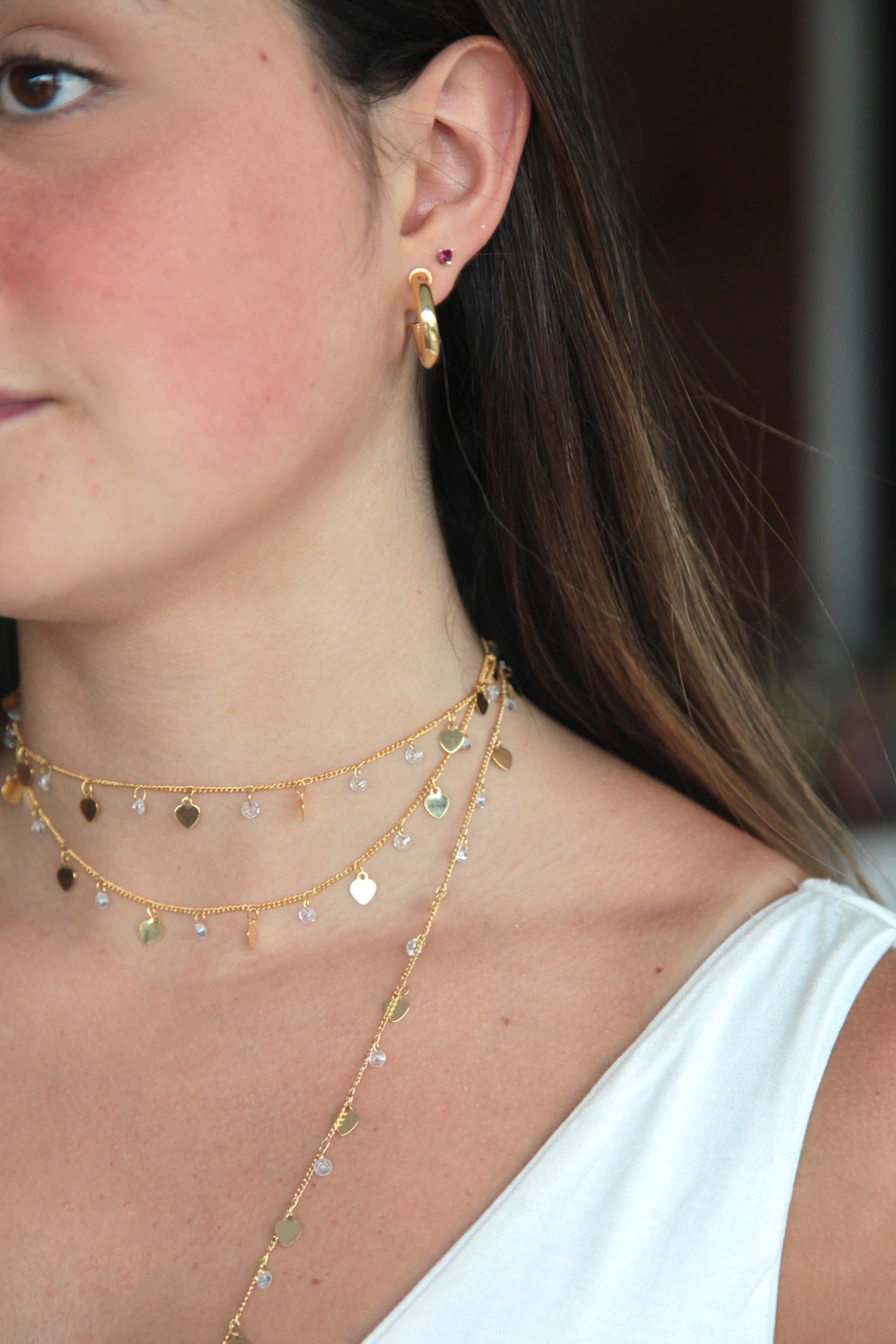 Colar longo com vários pingentes de corações e brilhinhos pendurados. A luz bate neles e reflete, trazendo um efeito iluminado. É uma peça must have.
