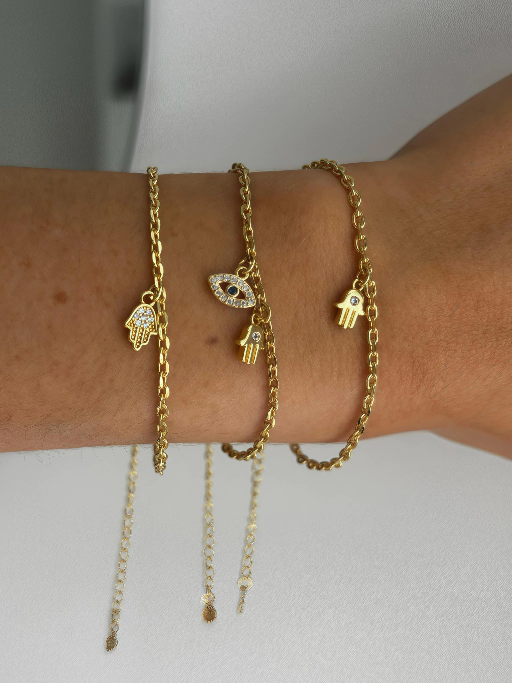 Pulseira delicada e chic com pingentes de Hamsá - tambem conhecido como "Mão de Fátima" - e olho grego cravejado. Eles são usados como amuletos contra mau-olhado e para atrair boa sorte, proteção e felicidade.